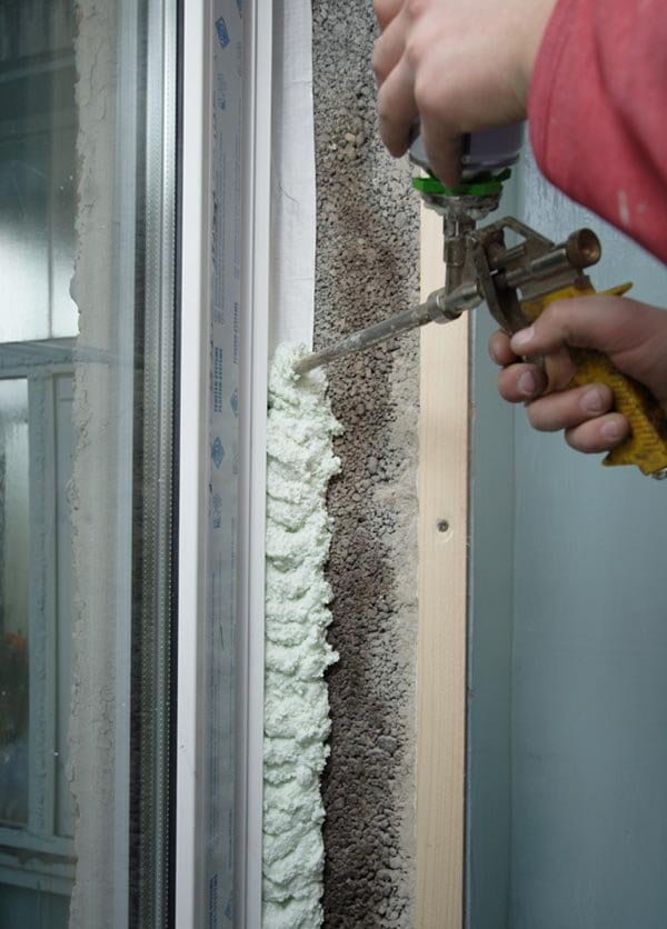 - Заполнение шва примыкания монтажной пеной